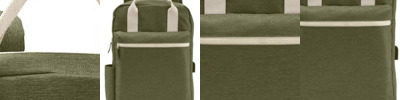 - Two front zippered pockets, one of which is a shoe pocket whereby wipe down lining can be rolled up when not in use to serve as a regular pocket
