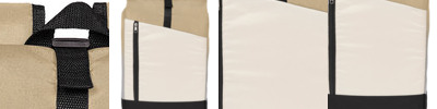 - Roll top opening to large compartment with snap buckle closure; front vertical zippered pocket